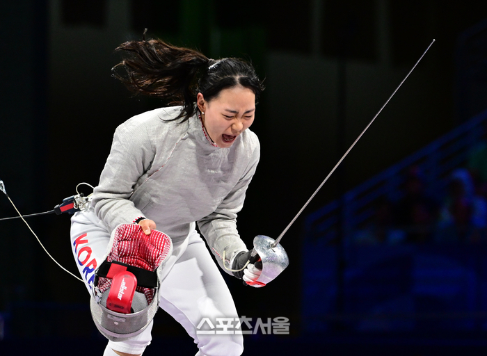 한국 펜싱 여자 사브르 대표팀(윤지수, 전하영, 최세빈, 전은혜)의 최세빈이 4일(한국 시간) 프랑스 파리 그랑팔레에서 열린 2024 파리올림픽 펜싱 여자 사브르 단체 결승전에서 우크라이나를 상대로 자신의 게임을 마치면서 포효하고 있다. 2024. 8. 4.