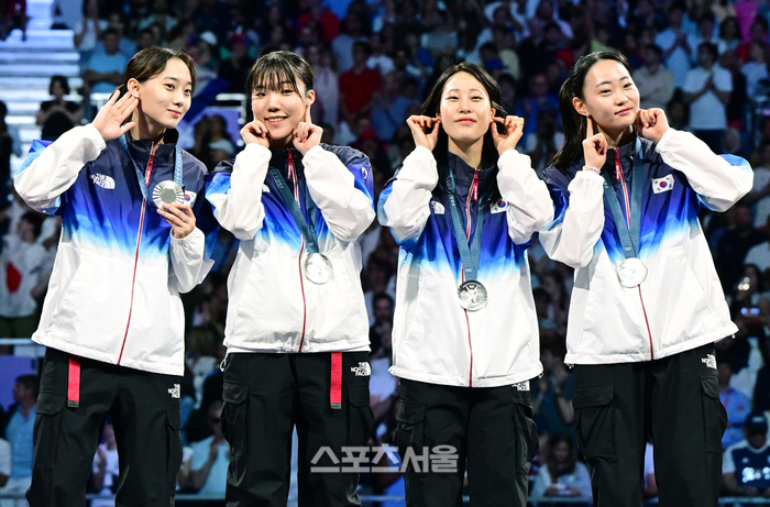 한국 펜싱 여자 사브르 대표팀(왼쪽부터 윤지수, 전하영, 전은혜, 최세빈)이 4일(한국 시간) 프랑스 파리 그랑팔레에서 열린 2024 파리올림픽 펜싱 여자 사브르 단체전에서 은메달을 딴 뒤 시상대 위에서 귀걸이를 뽐내는 세리머니를 하고 있다. 선수들은 태극기의 4괘와 태극 문양이 새겨진 귀걸이를 함께 착용하고 경기에 나섰다. 2024. 8. 4.