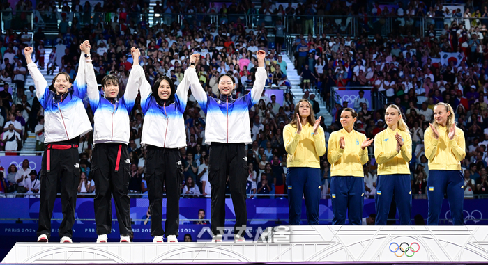 한국 펜싱 여자 사브르 대표팀(왼쪽부터 윤지수, 전하영, 전은혜, 최세빈)이 4일(한국 시간) 프랑스 파리 그랑팔레에서 열린 2024 파리올림픽 펜싱 여자 사브르 단체전에서 은메달을 딴 뒤 시상대에 오르고 있다. 2024. 8. 4.