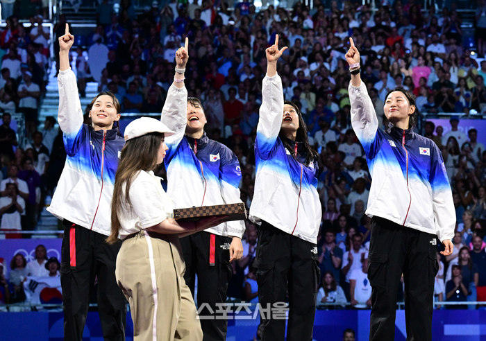 한국 펜싱 여자 사브르 대표팀(왼쪽부터 윤지수, 전하영, 전은혜, 최세빈)이 4일(한국 시간) 프랑스 파리 그랑팔레에서 열린 2024 파리올림픽 펜싱 여자 사브르 단체전에서 은메달을 딴 뒤 시상대에 오르면서 세리머니를 하고 있다. 2024. 8. 4.