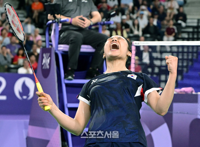 배드민턴 국가대표 안세영이 4일(한국 시간) 프랑스 파리 포르트드라샤펠 아레나에서 열린 2024 파리올림픽 배드민턴 여자 단식 4강전에서 인도네시아 툰중를 상대로 승리한 뒤 포효하고 있다. 2024. 8. 4.