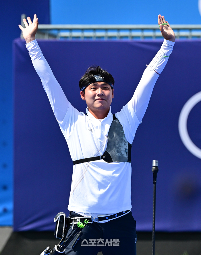 양궁 국가대표 이우석이 4일(한국 시간) 프랑스 파리 앵발리드에서 열린 파리올림픽 양궁 남자 개인전 이탈리아의 마우로 네스폴리와의 8강전에서 승리한 뒤 기뻐하고 있다. 2024. 8. 4.