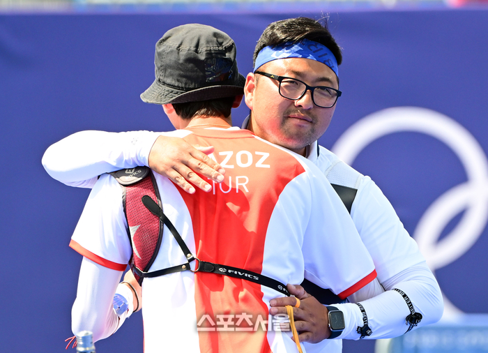 양궁 국가대표 김우진(오른쪽)이 4일(한국 시간) 프랑스 파리 앵발리드에서 열린 파리올림픽 양궁 남자 개인전 튀르키예의 메테 가조즈와의 8강전에서 힘겹게 승리를 한 상대 선수와 포옹을 하고 있다. 김우진은 이우석과 준결승에서 맞붙는다. 2024. 8. 4.