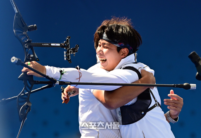 양궁 국가대표 이우석이 4일(한국 시간) 프랑스 파리 앵발리드에서 열린 파리올림픽 양궁 남자 개인전 동메달 결정전에서독일의 운루를 꺾고 동메달을 차지한 뒤 박성수 감독에게 안겨 기뻐하고 있다. 2024. 8. 4.