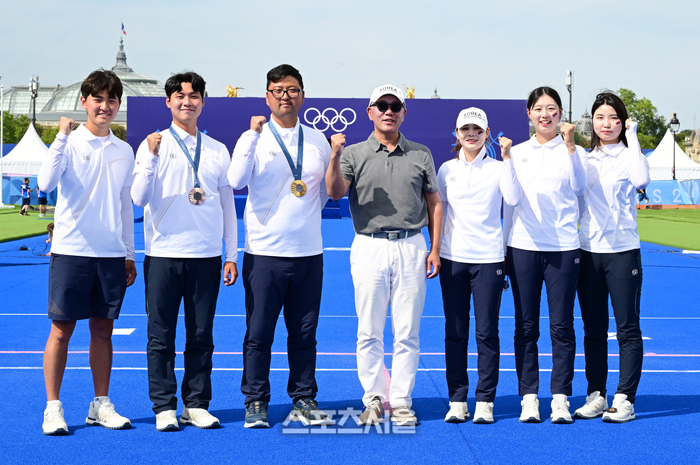 대한양궁협회장 겸 현대차그룹 정의선 회장(가운데)이 4일(한국 시간) 프랑스 파리 앵발리드에서 열린 파리올림픽 양궁 남자 개인 결승전 이후 대회에 걸린 5개의 금메달을 모두 따낸 남녀 양궁 대표팀과 함께 기념촬영을 하고 있다. 왼쪽부터 김제덕, 이우석, 김우진, 정의선 회장, 전훈영, 임시현, 남수현. 2024. 8. 4.