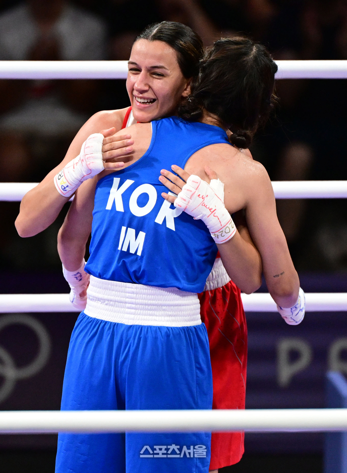 복싱 국가대표 임애지가 4일(한국 시간) 프랑스 파리 노스파리 아레나에서 열린 2024 파리올림픽 여자 복싱 54kg급 준결승전에서 튀르키예 아크바시에게 2대3으로 아쉽게 판정패한 뒤 상대 선수와 인사를 하고 있다. 2024. 8. 4.
