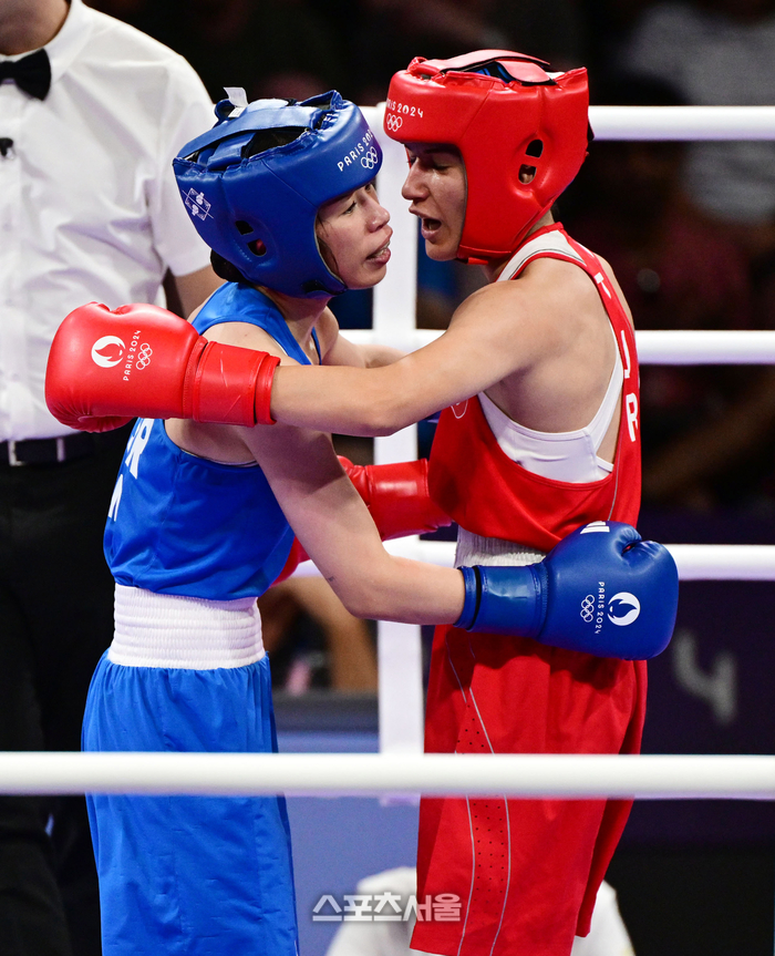 복싱 국가대표 임애지(왼쪽)가 4일(한국 시간) 프랑스 파리 노스파리 아레나에서 열린 2024 파리올림픽 여자 복싱 54kg급 준결승전에서 튀르키예 아크바시에게 2대3으로 아쉽게 판정패한 뒤 상대 선수와 인사를 하고 있다. 2024. 8. 4.