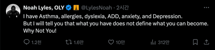라일스는 100m 우승 후 자신의 소셜미디어에 ‘나는 천식, 알레르기, 난독증, 부주의, 불안, 우울증을 앓고 살았다. 하지만 이런 증상이 우리가 어떤 사람이 될지 정의하는 것은 아니다. 당신도 못한다는 법은 없다!’라고 적었다.