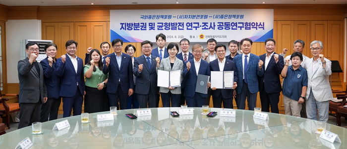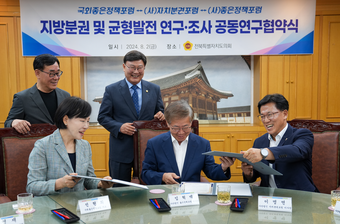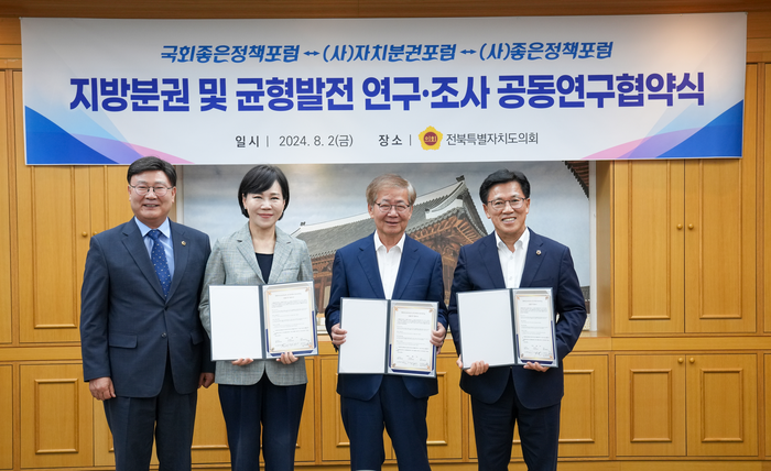 [스포츠서울ㅣ김기원기자]사단법인 자치분권포럼(이사장 이명연)은 지난 8월 2일 전북특별자치도의회 의장실에서 국회좋은정책포럼(대표 전현희 국회의원) 및 사단법인 좋은정책포럼(대표 임혁백)과 지방분권 및 균형발전의 성공적인 추진과 수행을 위한 업무협약을 체결했다.