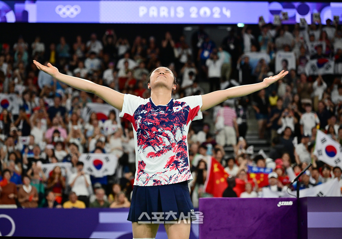 배드민턴 국가대표 안세영이 5일(한국 시간) 프랑스 파리 포르트 드 라 샤펠에서 열린 2024 파리올림픽 배드민턴 여자 단식 결승전에서 중국의 허빙자오를 꺾고 금메달을 딴 뒤 세리머니를 하고 있다. 2024. 8. 5.