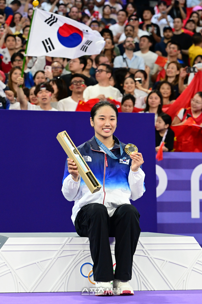 배드민턴 국가대표 안세영이 5일(한국 시간) 프랑스 파리 포르트 드 라 샤펠에서 열린 2024 파리올림픽 배드민턴 여자 단식 결승전에서 중국의 허빙자오를 꺾고 금메달을 딴 뒤 취재진을 향해 포즈를 취하고 있다. 2024. 8. 5.