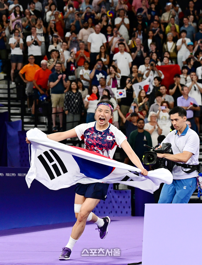 배드민턴 국가대표 안세영이 5일(한국 시간) 프랑스 파리 포르트 드 라 샤펠에서 열린 2024 파리올림픽 배드민턴 여자 단식 결승전에서 중국의 허빙자오를 꺾고 금메달을 딴 뒤 태극기를 들고 코트를 뛰어다니고 있다. 2024. 8. 5.