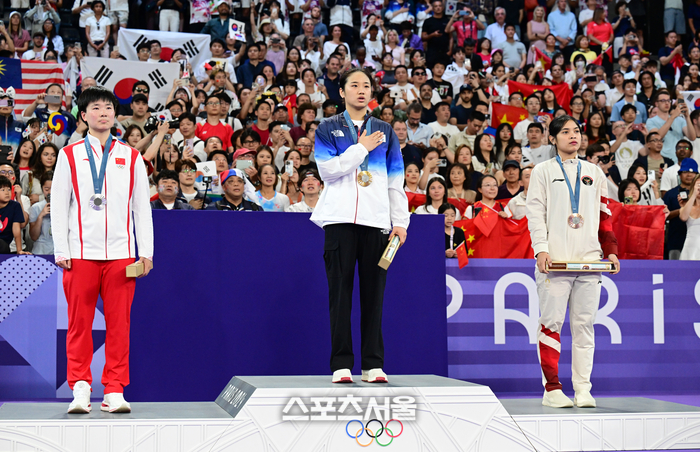 배드민턴 국가대표 안세영(가운데)이 5일(한국 시간) 프랑스 파리 포르트 드 라 샤펠에서 열린 2024 파리올림픽 배드민턴 여자 단식 결승전에서 중국의 허빙자오를 꺾고 금메달을 딴 뒤 시상대 위에서 애국가를 부르고 있다. 왼쪽부터 은메달 중국 허빙자오, 금메달 한국 안세영, 동메달 인도네시아 툰중. 2024. 8. 5.