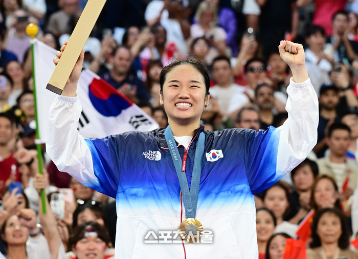 배드민턴 국가대표 안세영이 5일(한국 시간) 프랑스 파리 포르트 드 라 샤펠에서 열린 2024 파리올림픽 배드민턴 여자 단식 결승전에서 중국의 허빙자오를 꺾고 금메달을 딴 뒤 시상대 위에서 두 팔을 들어올리며 기뻐하고 있다. 2024. 8. 5.