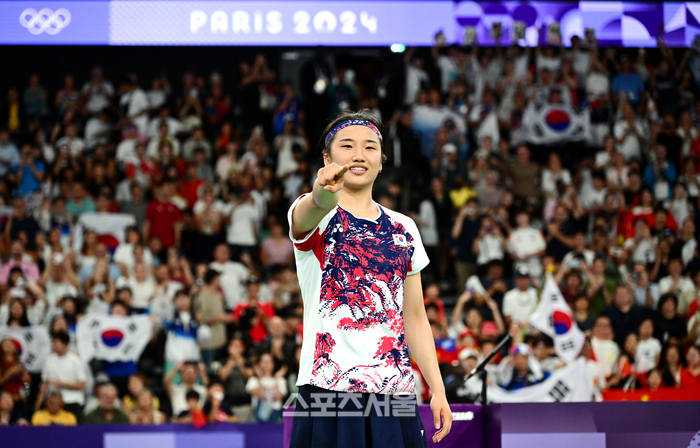 배드민턴 국가대표 안세영이 5일(한국 시간) 프랑스 파리 포르트 드 라 샤펠에서 열린 2024 파리올림픽 배드민턴 여자 단식 결승전에서 중국의 허빙자오를 꺾고 금메달을 딴 뒤 세리머니를 하고 있다. 2024. 8. 5.