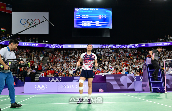 배드민턴 국가대표 안세영이 5일(한국 시간) 프랑스 파리 포르트 드 라 샤펠에서 열린 2024 파리올림픽 배드민턴 여자 단식 결승전에서 중국의 허빙자오를 꺾고 금메달을 확정한 뒤 세리머니를 하고 있다. 2024. 8. 5.