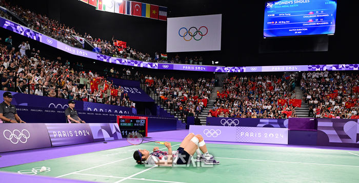 배드민턴 국가대표 안세영이 5일(한국 시간) 프랑스 파리 포르트 드 라 샤펠에서 열린 2024 파리올림픽 배드민턴 여자 단식 중국의 허빙자오와의 결승전에서 실점을 한 뒤 코트에 누워있다. 2024. 8. 5.
