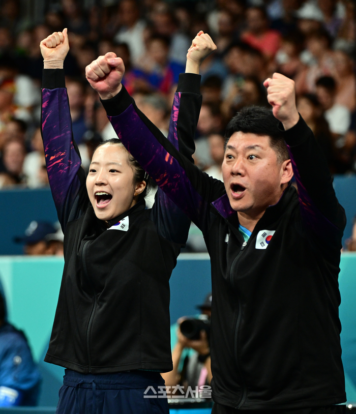 대한민국 여자 탁구 대표팀의 신유빈(왼쪽)과 오광헌 감독이 6일(한국 시간) 프랑스 파리 사우스 파리스 아레나4에서 열린 2024 파리올림픽 탁구 여자 단체 16강전에서 단식에 나선 이은혜의 득점에 기뻐하고 있다. 2024. 8. 6.