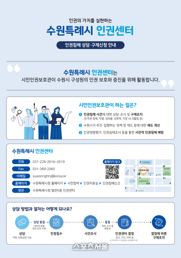 〔스포츠서울│수원=좌승훈기자〕경기 수원시는 사회복지시설 종사자, 공무직·청원경찰·환경관리원 등을 대상으로 ‘ 인권침해 실태조사’ 중 이라고 6일 밝혔다.