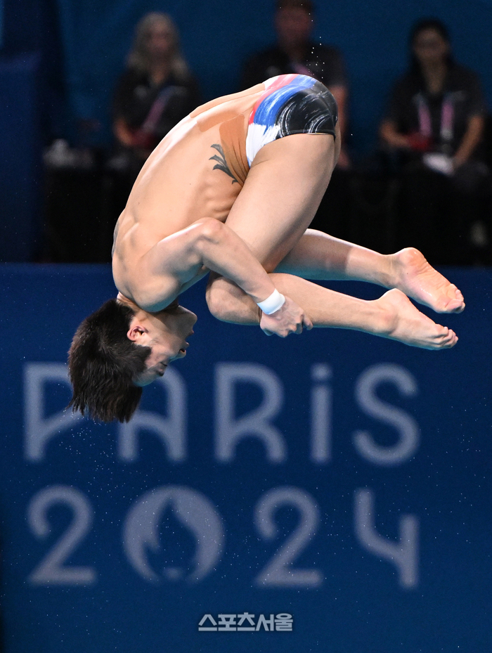 다이빙 국가대표 우하람이 6일(한국 시간) 프랑스 파리 아쿠아틱 센터에서 열린 2024 파리올림픽 다이빙 남자 3m 스프링보드 예선 경기에서 멋진 연기를 펼치고 있다. 2024. 8. 6.