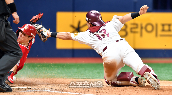 키움 포수 김건희가 6일 고척스카이돔에서 열리는 2024 프로야구 키움히어로즈와 SSG랜더스 경기 7회초 2사 2루 SSG 2번타자 추신수의 안타때 2루에서 홈까지 파고든 최지훈을 태그시도하고 있다. 원심은 세이프였고 키움의 비디오판독 요청이 있었지만 원심이 유지됐다. 2024.08.06.