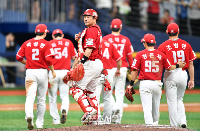 SSG 포수 이지영이 6일 고척스카이돔에서 열리는 2024 프로야구 키움히어로즈와 SSG랜더스 경기에서 역전승한 후 더그아웃으로 향하던 중 키움 선수들 쪽을 바라보고 있다. 2024.08.06.
