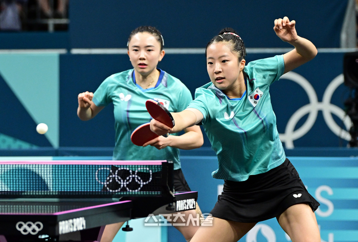대한민국 탁구 대표팀의 전지희-신유빈이 6일 프랑스 파리 사우스 파리스 아레나4에서 열린 2024 프랑스올림픽 탁구 여자 단체 8강전 1게임에서 스웨덴의 크리스티나 칼버그-필리파 베르간드 조를 상대하고 있다. 2024. 8. 6.
