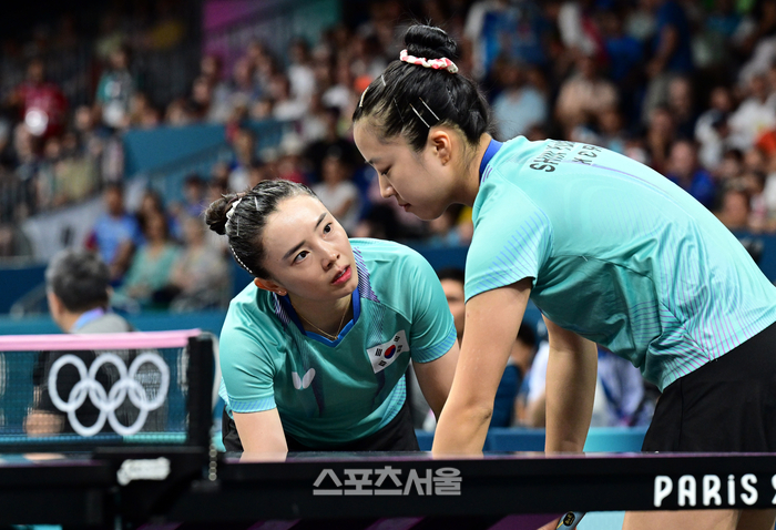 대한민국 탁구 대표팀의 전지희-신유빈이 6일 프랑스 파리 사우스 파리스 아레나4에서 열린 2024 프랑스올림픽 탁구 여자 단체 8강전 1게임에서 스웨덴의 크리스티나 칼버그-필리파 베르간드 조를 상대로 서브를 넣기 전 사인을 주고 받고 있다. 2024. 8. 6.