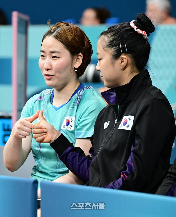 대한민국 탁구 대표팀의 이은혜(왼쪽)가 6일 프랑스 파리 사우스 파리스 아레나4에서 열린 2024 프랑스올림픽 탁구 여자 단체 8강전 2게임에서 스웨덴의 린다 버그스트롬을 상대로 승리한 뒤 신유빈과 엄지를 맞대고 있다. 2024. 8. 6.
