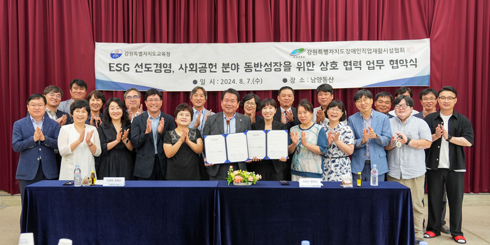 [스포츠서울ㅣ춘천=김기원기자]강원특별자치도교육청(교육감 신경호)과 강원특별자치도 장애인직업재활시설협회는 7일(수) 오전 10시, 춘천시 신북읍 남양동산에서 ‘ESG 선도경영, 사회공헌 분야 동반성장을 위한 업무협약’을 체결했다.