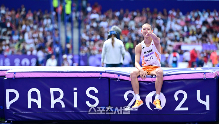 대한민국 육상 높이뛰기 대표 우상혁이 7일(한국 시간) 프랑스 파리 스타드 드 프랑스에서 열린 2024 파리올림픽 육상 남자 높이뛰기 예선에서 2m27를 2차 시기에서 뛰어 넘은 뒤 세리머니를 하고 있다. 우상혁은 결선에 진출했다. 2024.8.7