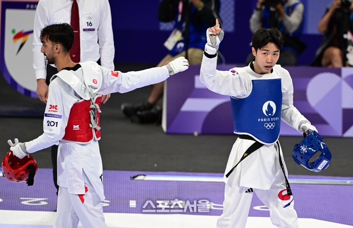 대한민국 태권도 국가대표 박태준(오른쪽)이 7일(한국 시간) 프랑스 파리 그랑팔레에서 열린 2024 파리올림픽 태권도 남자 58㎏급 준결승전에서 모하메드 칼릴 젠두비(튀니지)를 상대로 승리 한 뒤 기뻐하고 있다. 2024.8.7