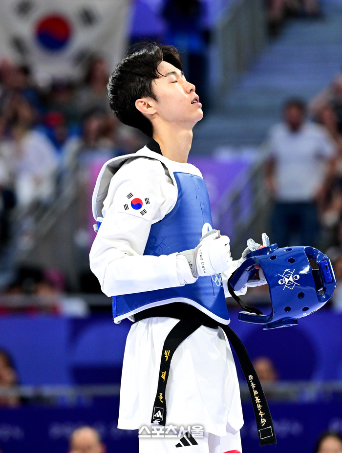 대한민국 태권도 국가대표 박태준이 7일(한국 시간) 프랑스 파리 그랑팔레에서 열린 2024 파리올림픽 태권도 남자 58㎏급 준결승전에서 모하메드 칼릴 젠두비(튀니지)를 상대로 승리한 뒤 세리머니를 하고 있다. 2024.8.7