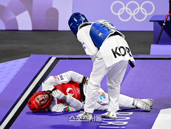 대한민국 태권도 국가대표 박태준이 8일(한국 시간) 프랑스 파리 그랑팔레에서 열린 2024 파리올림픽 태권도 남자 58㎏급 결승전에서 부상을 당한 가심 마고메도프(아제르바이잔)을 살피고 있다. 2024.8. 8.