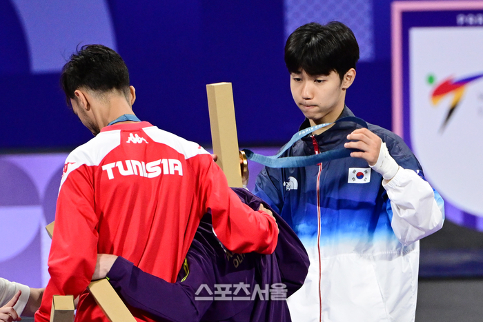 대한민국 태권도 국가대표 박태준이 8일(한국 시간) 프랑스 파리 그랑팔레에서 열린 2024 파리올림픽 태권도 남자 58㎏급 결승전에서 가심 마고메도프(아제르바이잔)을 꺾고 금메달을 따낸 뒤 시상식에서 목에 걸었던 메달을 바로 목에서 빼고 있다. 2024.8. 8.