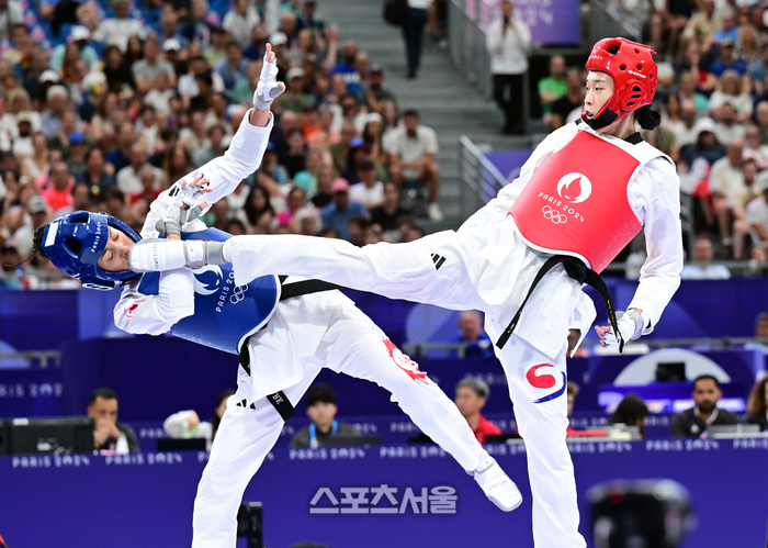 대한민국 태권도 국가대표 김유진(오른쪽)이 8일(한국 시간) 프랑스 파리 그랑팔레에서 열린 2024 파리올림픽 태권도 여자 57㎏급 8강전에서 캐나다의 스카일라 박을 상대로 공격을 하고 있다. 김유진은 스카일라 박을 2-0으로 꺾고 준결승에 진출했다. 2024.8. 8.