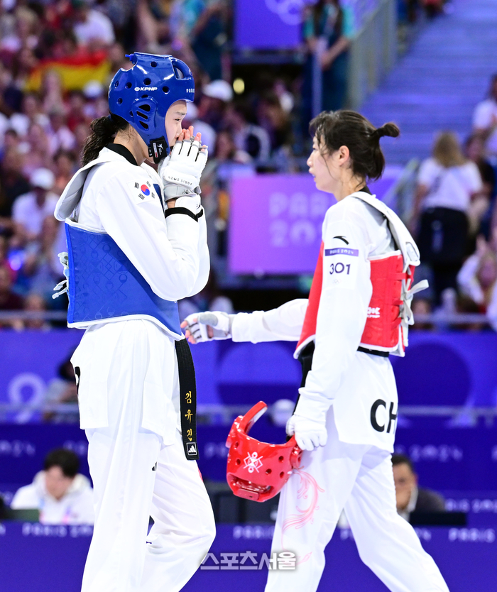 대한민국 태권도 국가대표 김유진이 8일(한국 시간) 프랑스 파리 그랑팔레에서 열린 2024 파리올림픽 태권도 여자 57㎏급 준결승전에서 세계 1위 중국의 뤄쭝스를 꺾고 결승 진출을 확정한 뒤 눈물을 훔치고 있다. 2024.8. 8.