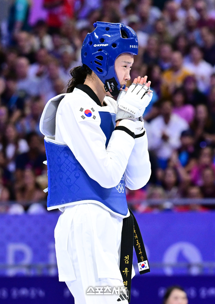 대한민국 태권도 국가대표 김유진이 8일(한국 시간) 프랑스 파리 그랑팔레에서 열린 2024 파리올림픽 태권도 여자 57㎏급 준결승전에서 세계 1위 중국의 뤄쭝스를 꺾고 결승 진출을 확정한 뒤 눈물을 훔치고 있다. 2024.8. 8.