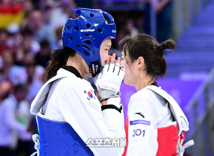 대한민국 태권도 국가대표 김유진이 8일(한국 시간) 프랑스 파리 그랑팔레에서 열린 2024 파리올림픽 태권도 여자 57㎏급 준결승전에서 세계 1위 중국의 뤄쭝스를 꺾고 결승 진출을 확정한 뒤 눈물을 훔치고 있다. 2024.8. 8.