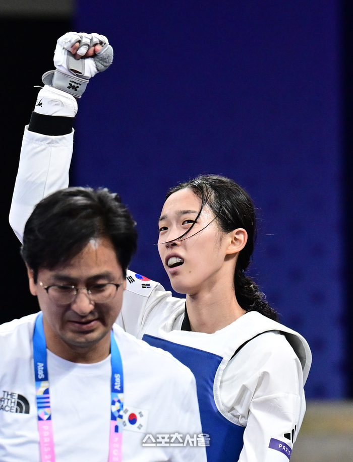 대한민국 태권도 국가대표 김유진이 8일(한국 시간) 프랑스 파리 그랑팔레에서 열린 2024 파리올림픽 태권도 여자 57㎏급 준결승전에서 세계 1위 중국의 뤄쭝스를 꺾고 결승 진출을 확정한 뒤 기뻐하고 있다. 2024.8. 8.