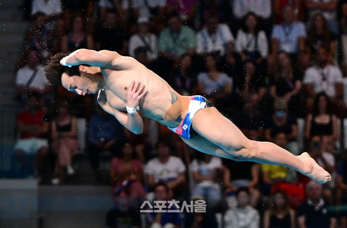 대한민국 다이빙 국가대표 우하람이 8일(한국 시간) 프랑스 파리 아쿠아틱 센터에서 열린 2024 파리올림픽 다이빙 남자 3m 스프링보드 결선에서 멋진 연기를 펼치고 있다. 우하람은 합계 374.15점으로 12명의 선수 중 11위를 기록했다. 2024. 8. 8.
