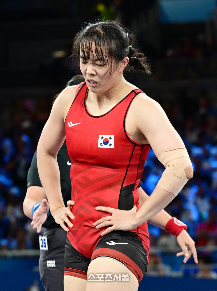 대한민국 레슬링 국가대표 이한빛이 9일(한국 시간) 프랑스 파리 샹 드 마르스 아레나에서 열린 2024 파리올림픽 레슬링 여자 자유형 62㎏급 16강전에서 독일의 루아시 니메쉬에 3-0으로 패한 뒤 아쉬워하고 있다.