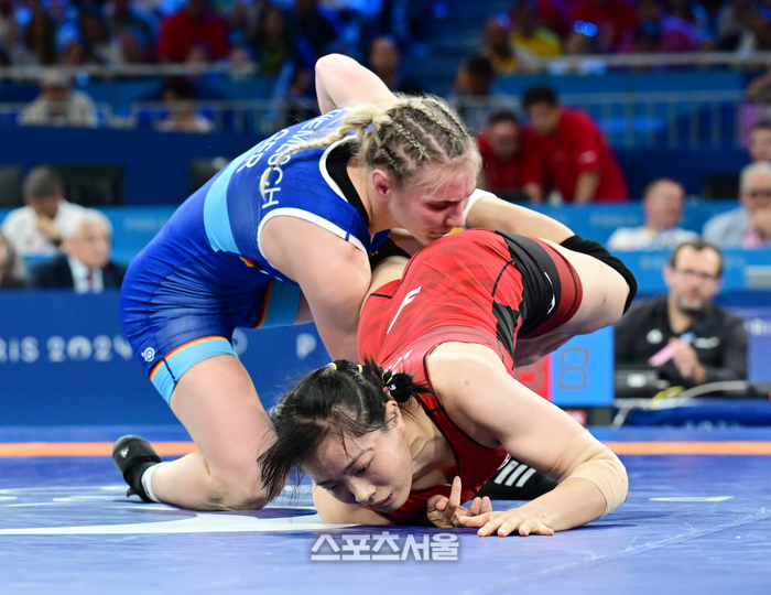 대한민국 레슬링 국가대표 이한빛(아래)이 9일(한국 시간) 프랑스 파리 샹 드 마르스 아레나에서 열린 2024 파리올림픽 레슬링 여자 자유형 62㎏급 16강전에서 독일의 루아시 니메쉬에 실점을 하고 있다.