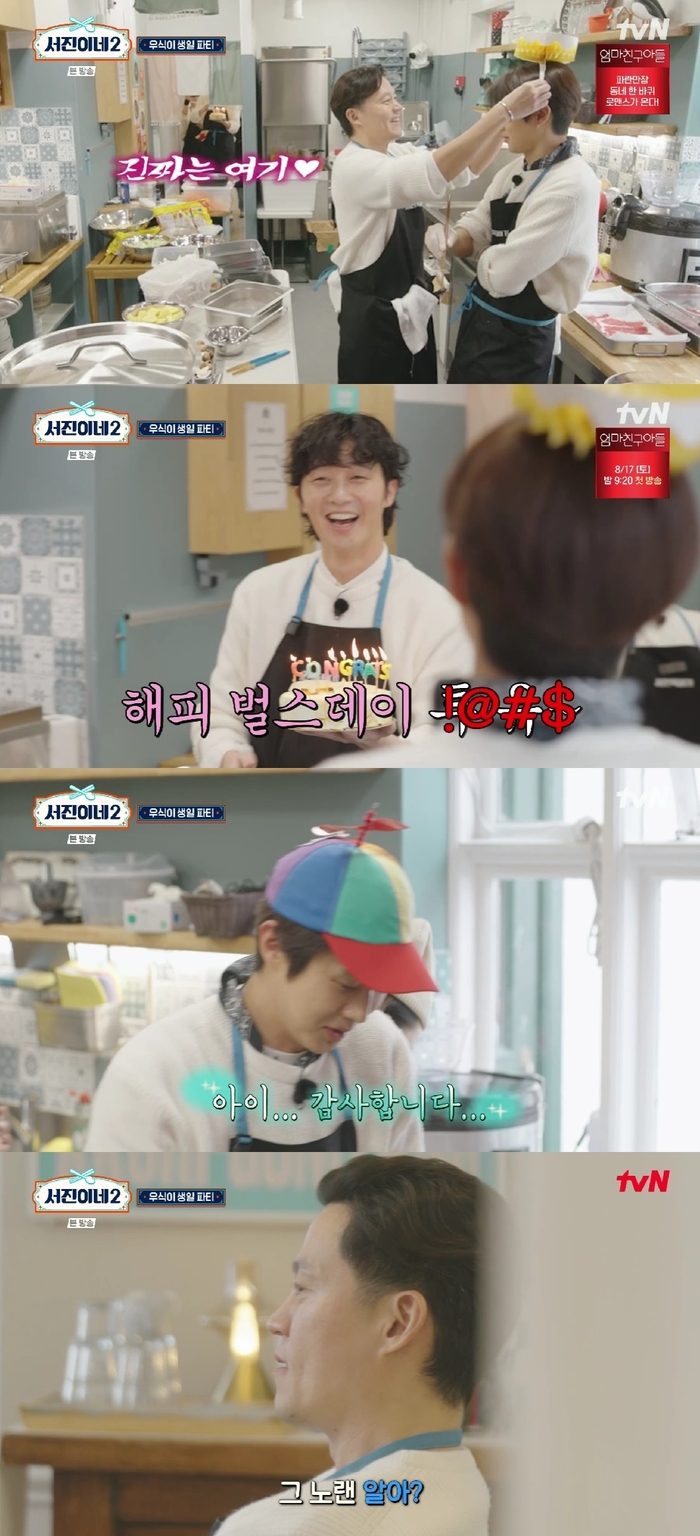 전날 밤 생일파티 패스에 이어 오전 장사준비까지 파티를 꽁꽁 숨겼던 멤버들은 박서준의 눈짓에 막간 생파를 진행했다.