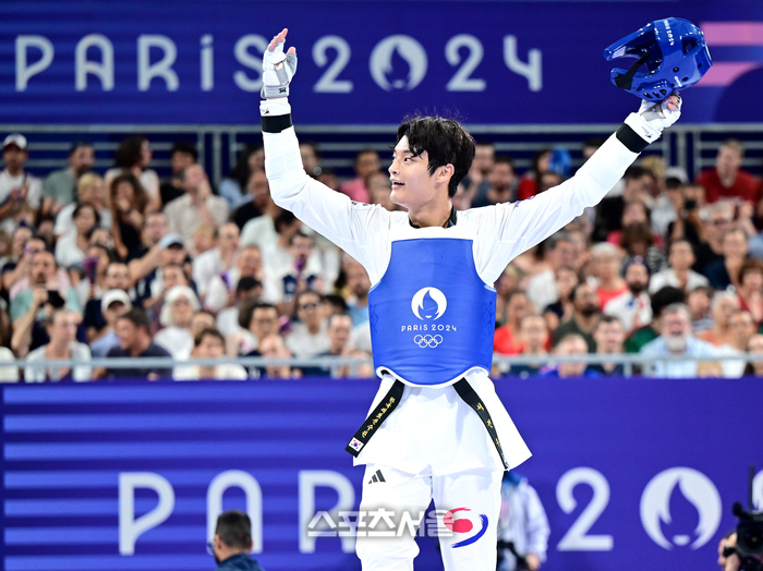 대한민국 태권도 국가대표 서건우가 9일(한국 시간) 프랑스 파리 그랑팔레에서 열린 2024 파리올림픽 태권도 남자 80㎏급 브라질의 브라질 엔리케 마르케스 로드리게스 페르난데스와의 8강전에서 승리한 뒤 기뻐하고 있다. 2024. 8. 9.