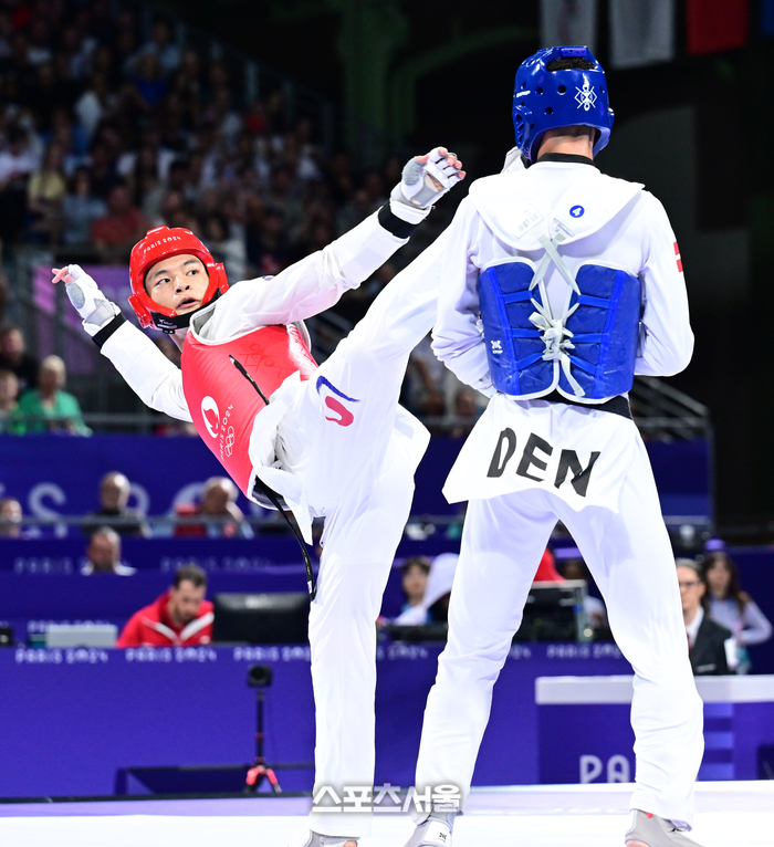 대한민국 태권도 국가대표 서건우가 10일(한국 시간) 프랑스 파리 그랑팔레에서 열린 2024 파리올림픽 태권도 남자 80㎏급 덴마크의 에디 흐르니치와의 동메달 결정전에서 발차기 공격을 하고 있다. 서건우는 0-2로 패하며 메달 획득에 실패했다. 2024. 8. 10.