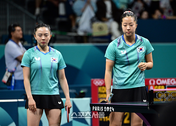 대한민국 탁구 국가대표 전지희-신유빈이 10일(한국 시간) 프랑스 파리 사우스 파리 아레나4에서 열린 2024 파리올림픽 탁구 여자 단체 동메달 결정전에서 독일의 산샤오나와 완위안 조를 상대로 실점한 뒤 아쉬워하고 있다. 2024. 8. 10.