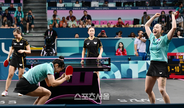 대한민국 탁구 국가대표 신유빈-전지희 조가 10일(한국 시간) 프랑스 파리 사우스 파리 아레나4에서 열린 2024 파리올림픽 탁구 여자 단체 동메달 결정전에서 독일의 산샤오나-완위안 조를 상대로 승리한 뒤 기뻐하고 있다. 2024. 8. 10.