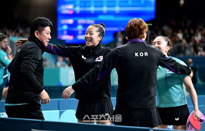 대한민국 탁구 국가대표 오광헌 감독(왼쪽부터), 신유빈, 이은혜, 전지희가 10일(한국 시간) 프랑스 파리 사우스 파리 아레나4에서 열린 2024 파리올림픽 탁구 여자 단체 동메달 결정전에서 독일을 3-0으로 꺾고 동메달을 차지한 뒤 함께 기뻐하고 있다. 2024. 8. 10.