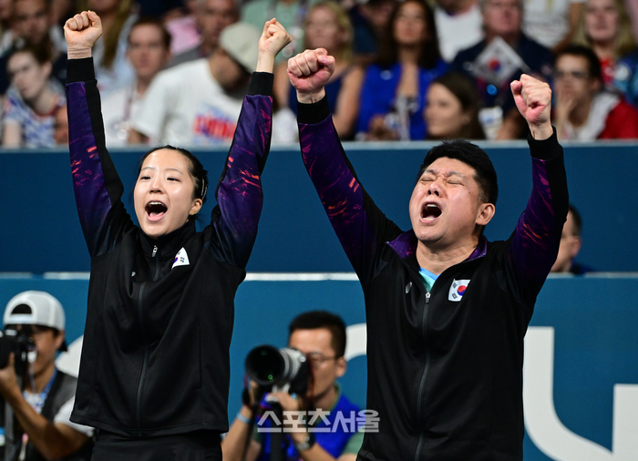 대한민국 탁구 국가대표 신유빈(왼쪽)과 오광헌 감독이 10일(한국 시간) 프랑스 파리 사우스 파리 아레나4에서 열린 2024 파리올림픽 탁구 여자 단체 동메달 결정전에서 이은혜의 득점에 기뻐하고 있다. 한국 여자 탁구 대표팀은 독일을 3-0으로 꺾고 꺾고 동메달을 땄다. 2024. 8. 10.